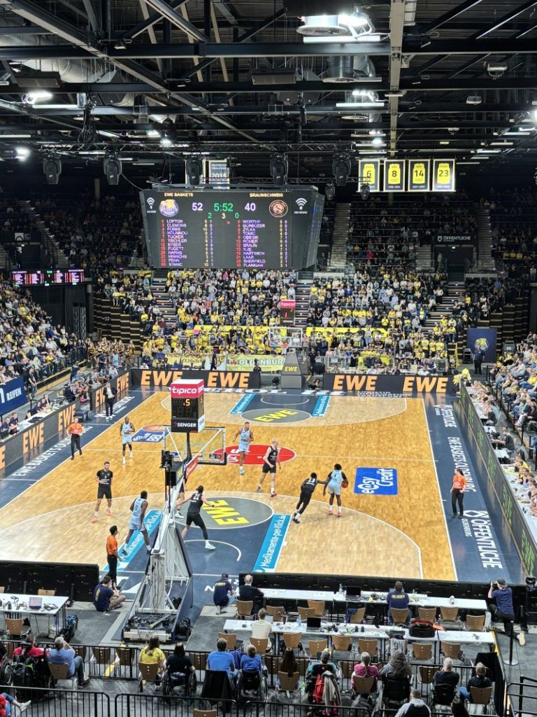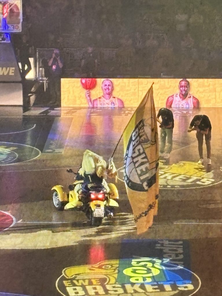 Die Baskets haben dann in einem Testspiel gegen die Braunschweiger Löwen gespielt und knapp gewonnen. Das Spiel war sehr spannend und unterhaltsam. Die Baskets spielten in ihren Alternativtrikots, so ein taubengrau-hellblau? ich fand diese Trikots nicht so schön, da sie wenig vom gelb-blau der Baskets hatten, aber so etwas ist ja bekanntlich Geschmackssache und die Geschmäcker sind alle verschieden.